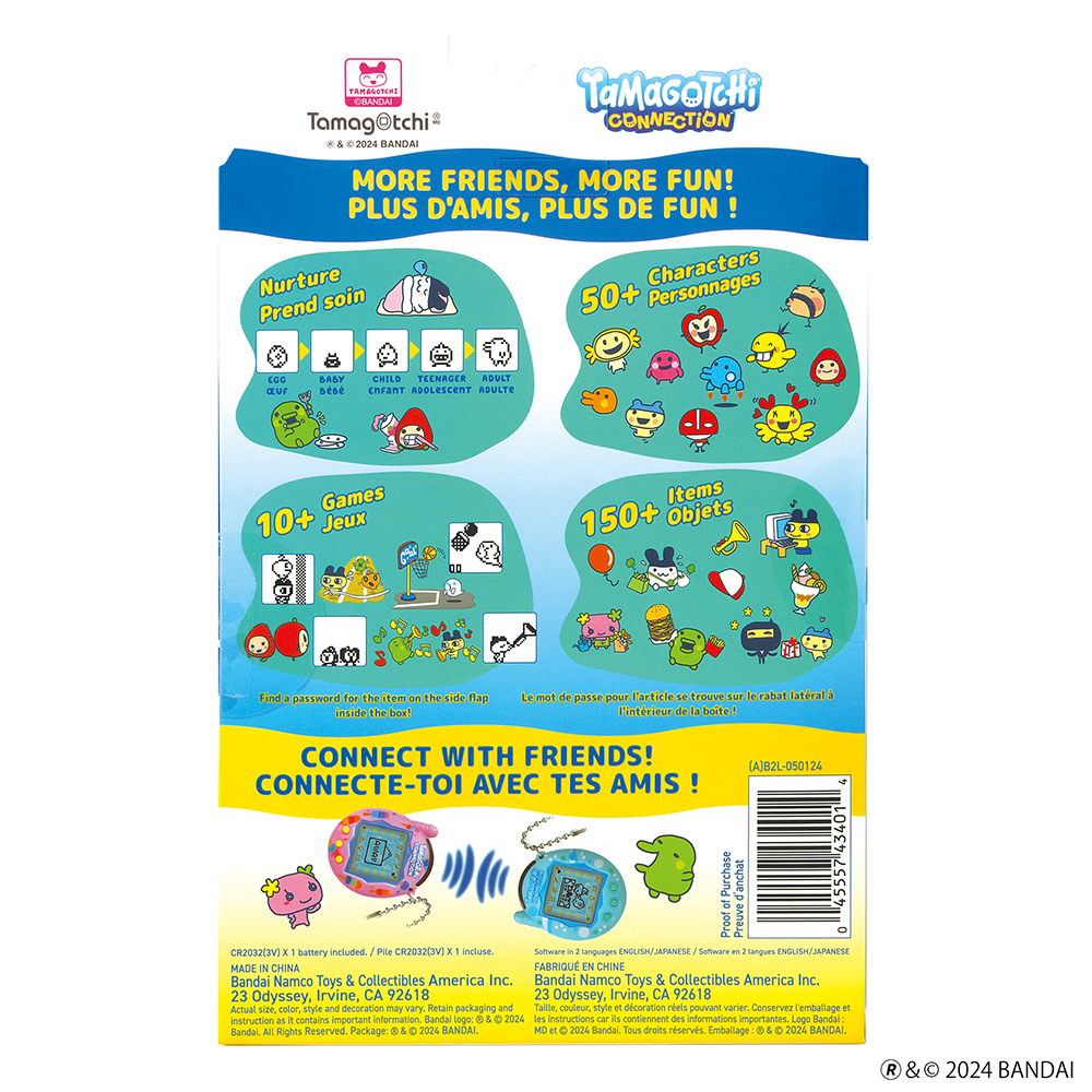 Votre personnage Tamagotchi peut se connecter à d'autres pour se faire des amis, jouer à des jeux et échanger des cadeaux ! Marie-toi et élève des générations de Tamagotchi.