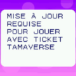 Pour jouer avec les personnages Ticket Tamaverse Sanrio characters, vous devez mettre à jour votre appareil Tamagotchi Uni vers la version 2.0.0 ou supérieure. Après l'écran suivant, veuillez mettre à jour votre appareil. Cliquez sur ici pour savoir comment mettre à jour.