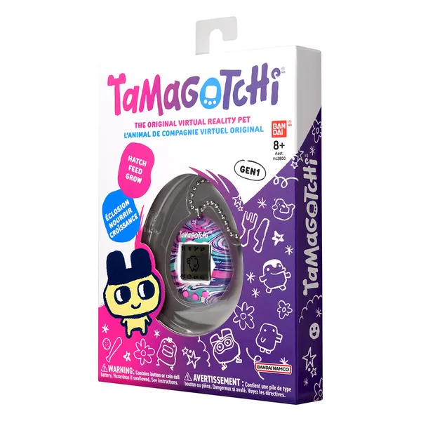 ● Scocca in marmo viola con ' Tamagotchi' bianco e cornice con pulsanti rosa, programmazione e personaggi originali e logo aggiornato