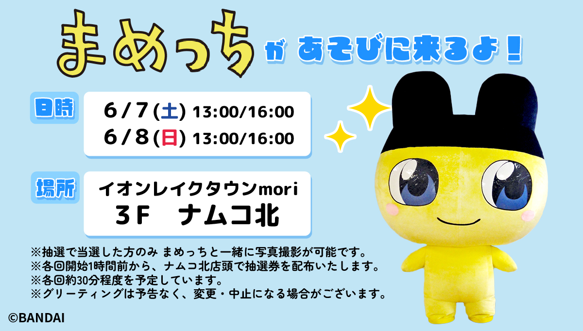 6月 14 日 ( 土 ) にたまごっちのおみせ越谷がオープンする「 イオンレイクタウン」にまめっちがやってくるよ!