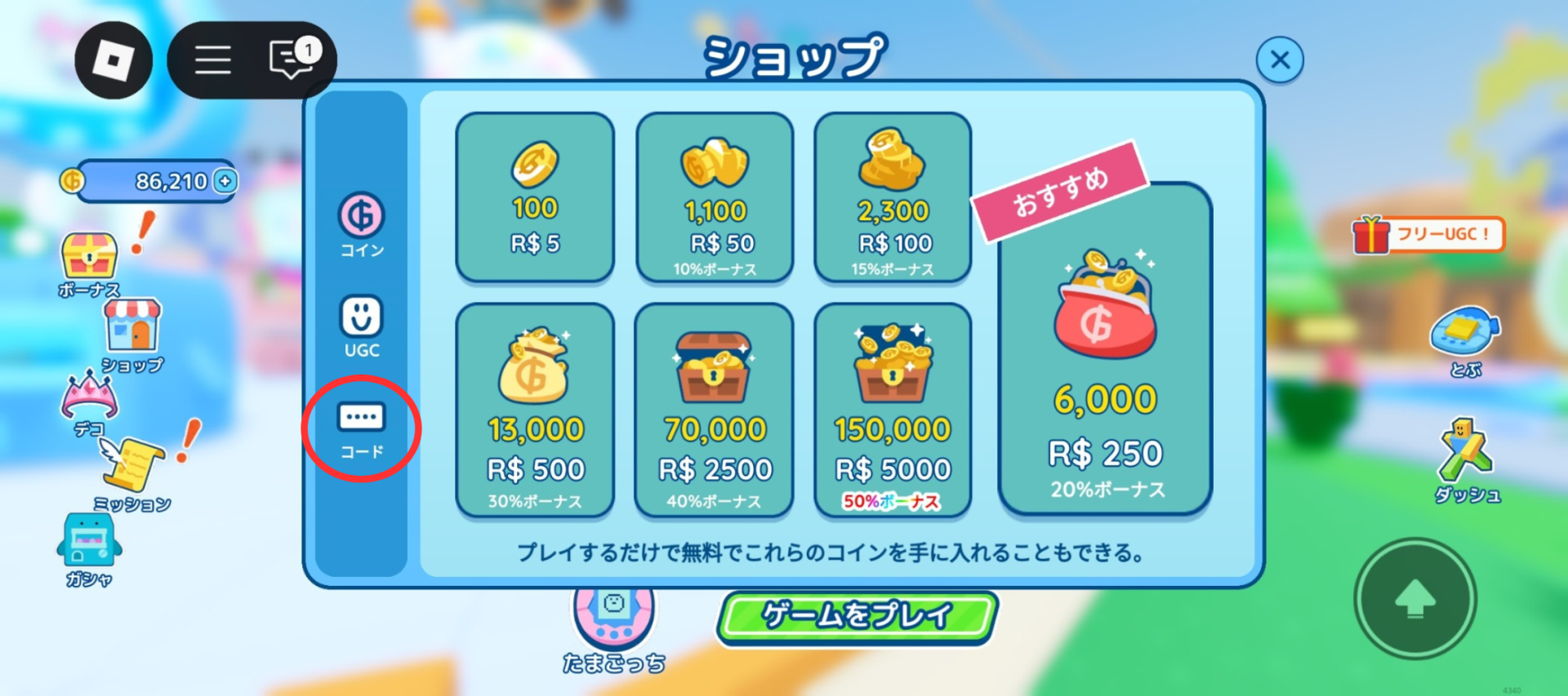②ショップ画面の左下にある「コード」ボタンを選択します。