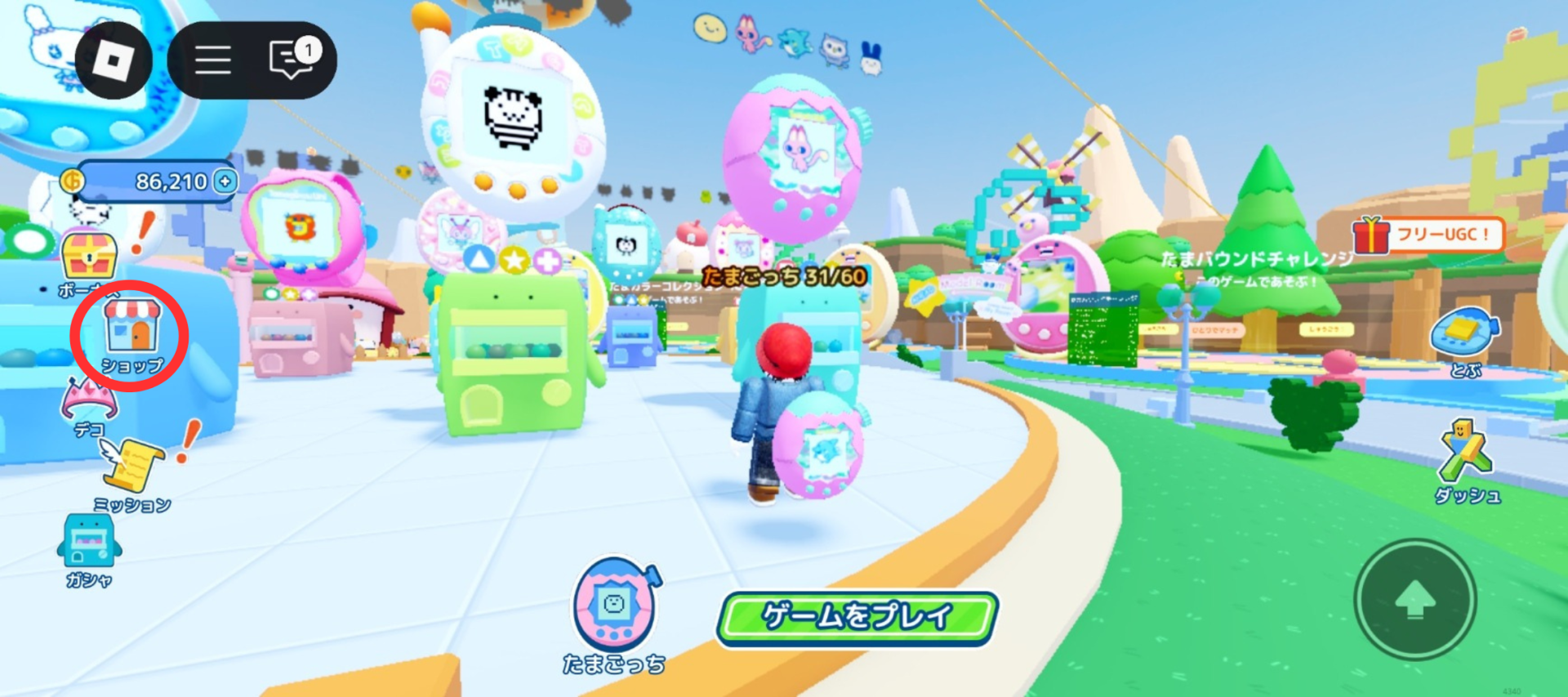①Roblox「Tamagotchi Party」のゲーム画面左側にある「ショップ」アイコンを選択します。