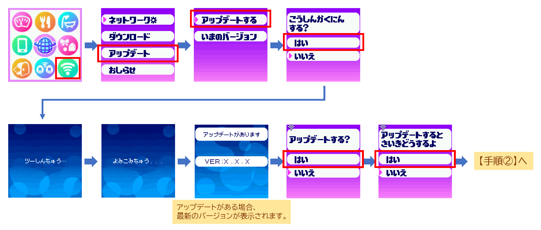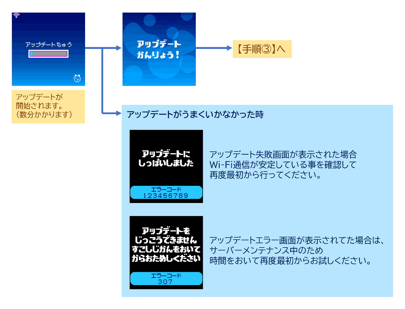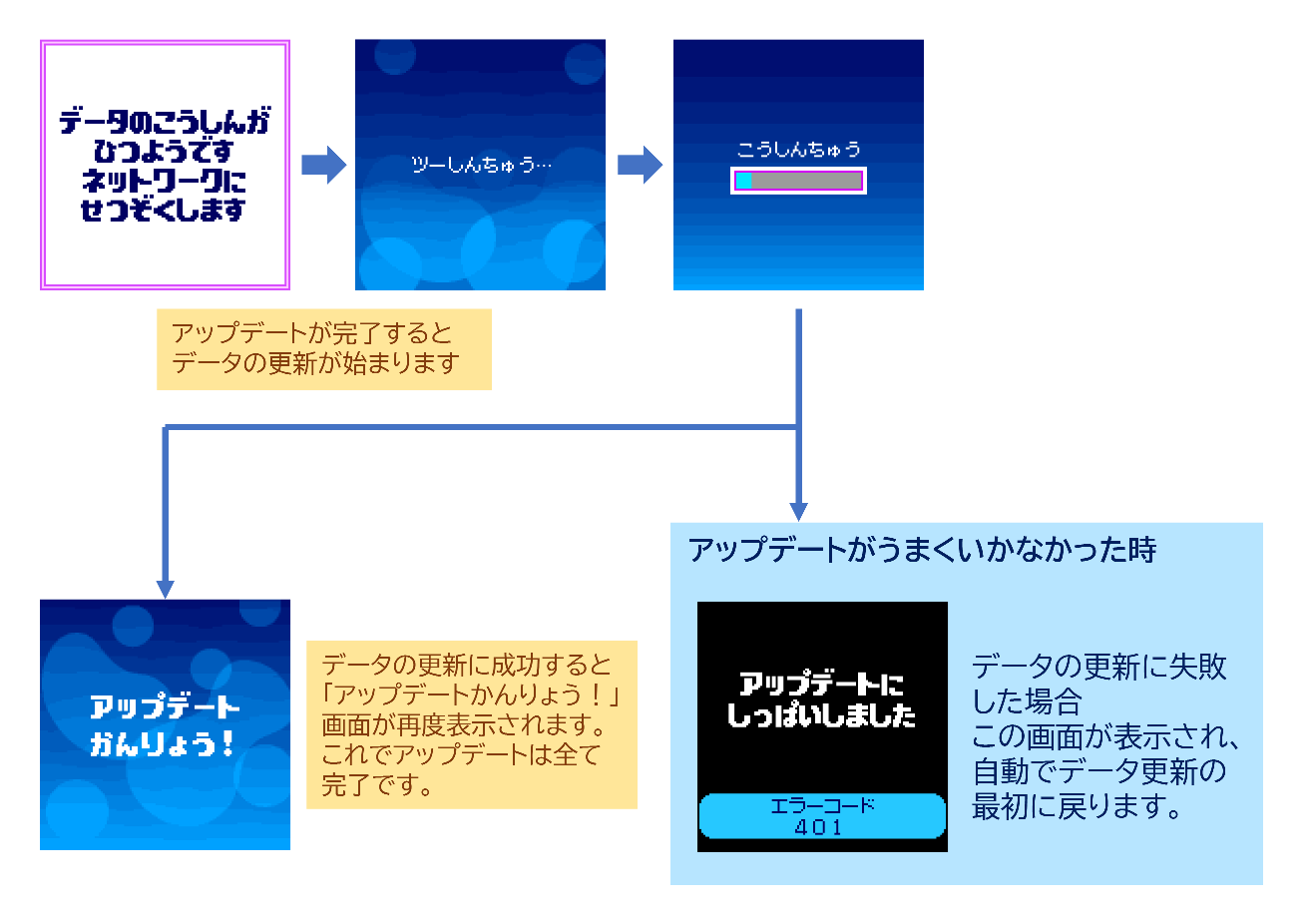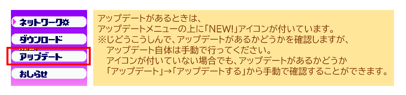 アップデート中に電源が切れると、アップデートが正常に行われなかったりプレイデータが消えてしまう可能性があります。