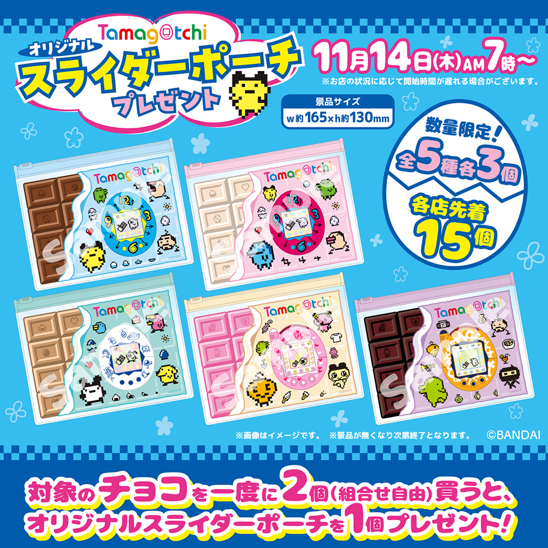 対象のチョコレート菓子を一度に2個(組合せ自由)買うと、たまごっちオリジナルスライダーポーチ1個プレゼント🎁