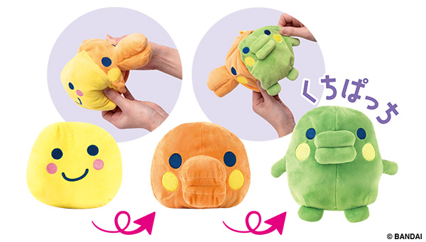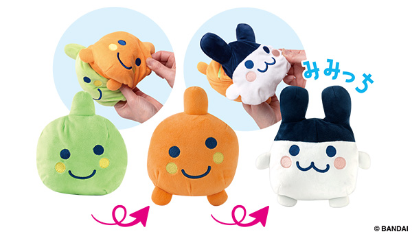 3変形ぬいぐるみは全4種で、たまごっちの成長を表すように変形させることができるよ!