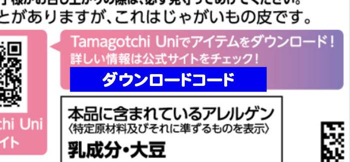 パッケージ裏面に書かれた16桁のダウンロードコードをTamagotchi Uniに入力すると、おどうぐアイテム“じゃがりこキット”がもらえる!