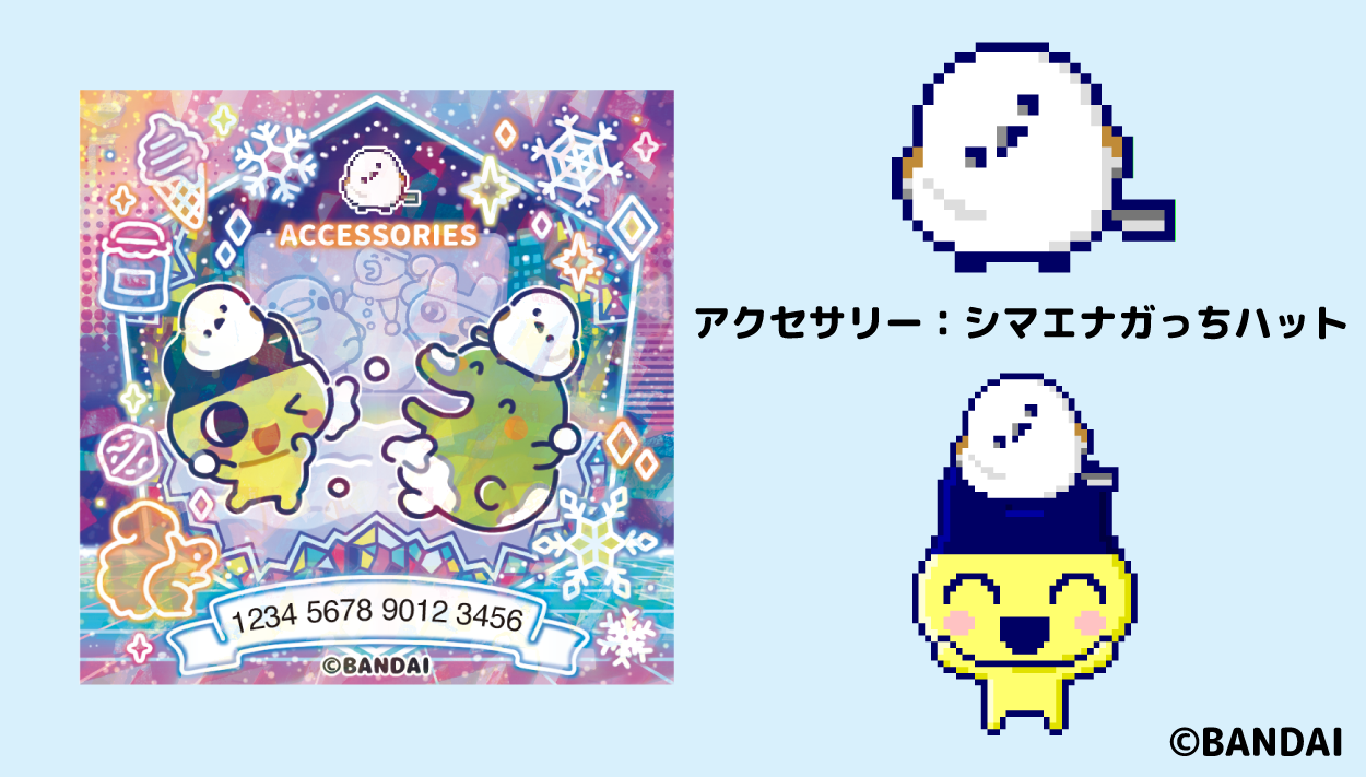 ステッカーに記載されている16ケタのダウンロードコードをTamagotchi Uniに入力することで、たまごっちたちが身に着けられるアクセサリー「シマエナガっちハット」がゲットできるよ!