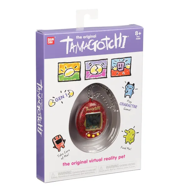 ●Rood-glitterende schaal met gouden ' Tamagotchi', frame en knoppen, en originele programmering en karakters.