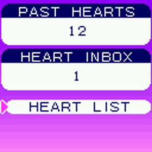 Vanuit de HEART LIST (HARTLIJST) kun je de profielen bekijken van de Tamagotchi personages die HEARTS (HARTEN) naar je hebben gestuurd. Je kunt een HEART (HART) teruggeven als bedankje door op de B-KNOP te drukken.
